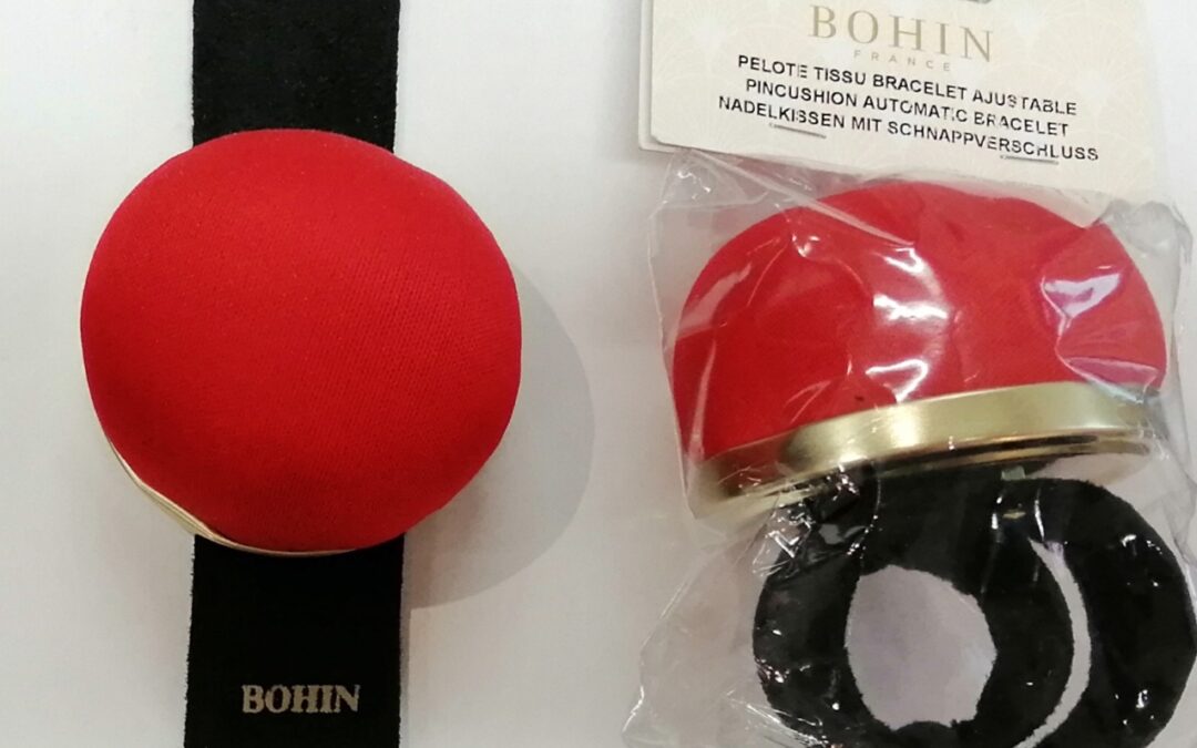Käsivarteen tai ranteeseen kääntyvä pehmeä neulatyyny. Punainen tyyny osa ja musta varsi, joka taipuu näppäristä eri kokoisen käden ympärille.