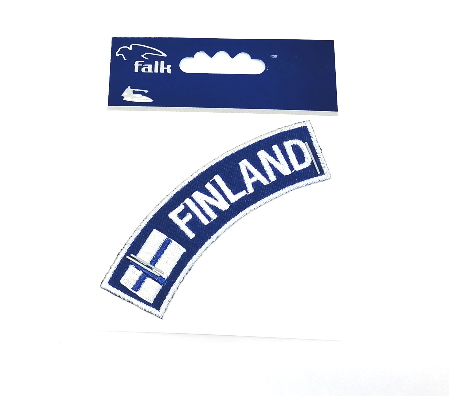 pieni Suomen lippua sekä teksti Finland broderattuna kaarevaan kankaaseen