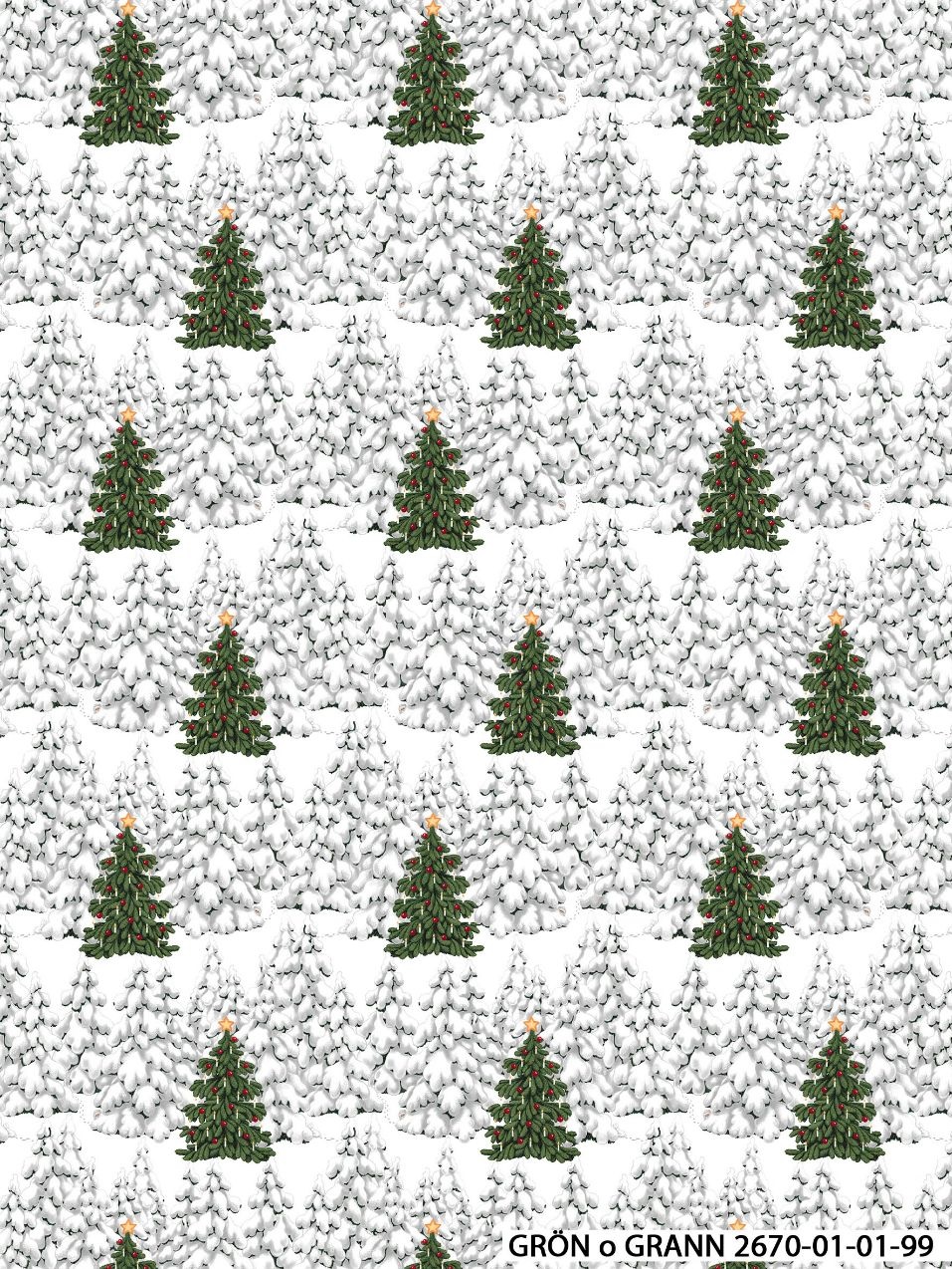 Valkoinen pohja, jossa lumisia kuusia sekä yksittäisiä vihreitä, koristeltuja kuusia.