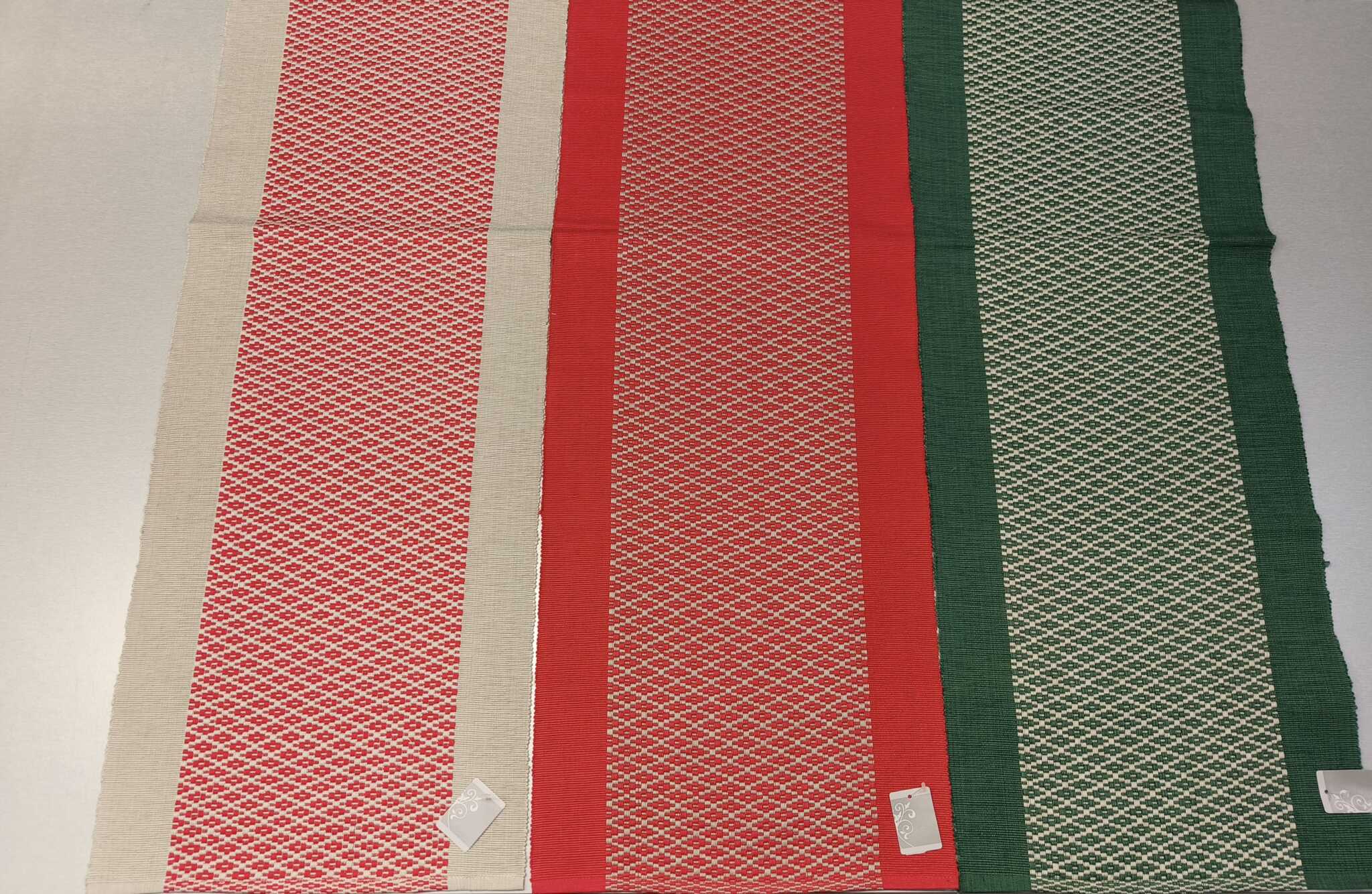 Kolme värivaihtoehtoa: pellava/punainen, punainen/pellava tai vihreä/pellava