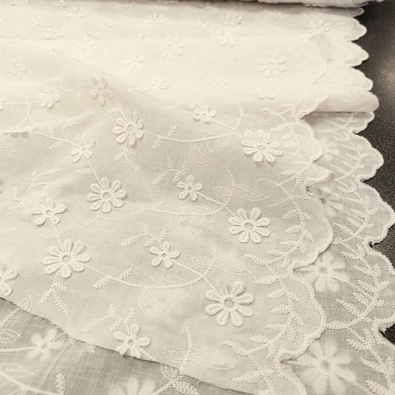 Laadukas puuvillakangas, jossa prodeerattuja kukkia.