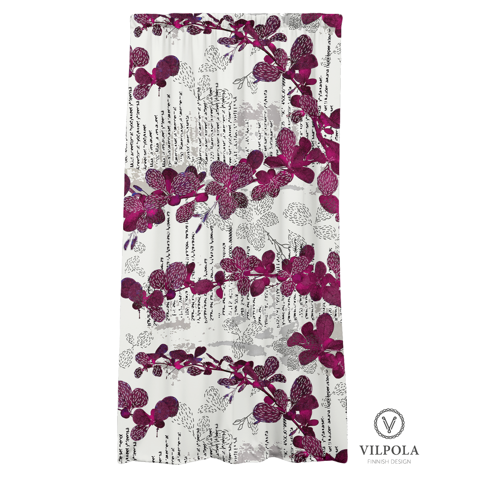 Valkoinen pohja, jossa purppura kukkakuviointi.
