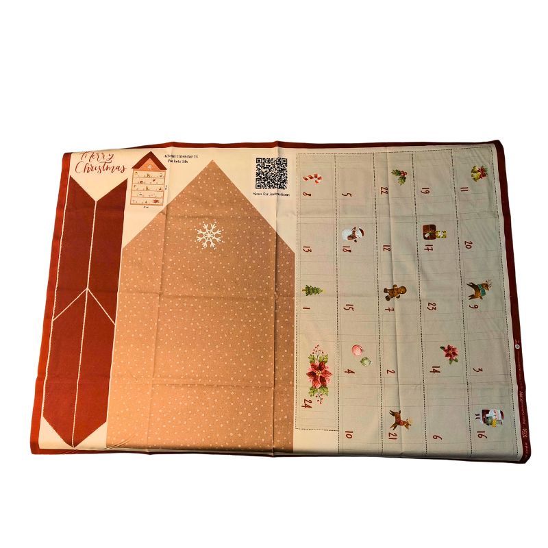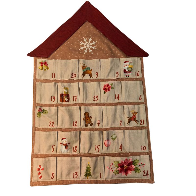 Puuvillakankaassa painettuna talo sekä 24 joulukalenteritaskua. Taskut avautuvat laskoksella, joten mahtuu kivasti yllätyksiä.