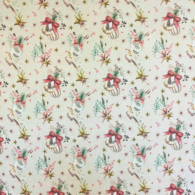 Painettu puuvillakangas, jossa pellavan sävyisellä pohjalla joulupallo-asetelmia.