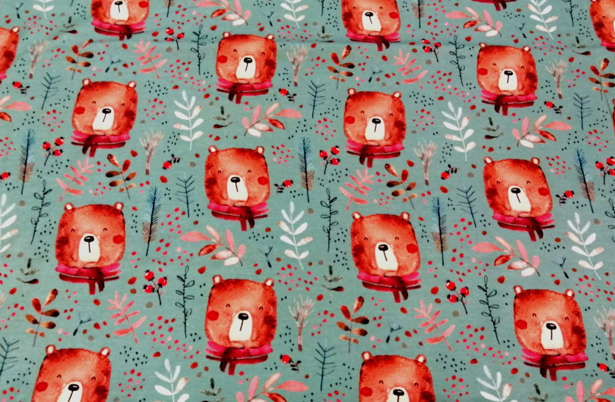 Siniharmaalla pohjalla käsin piirrettynä karhunpennun pää sekä varpuja ja puolukkaa.