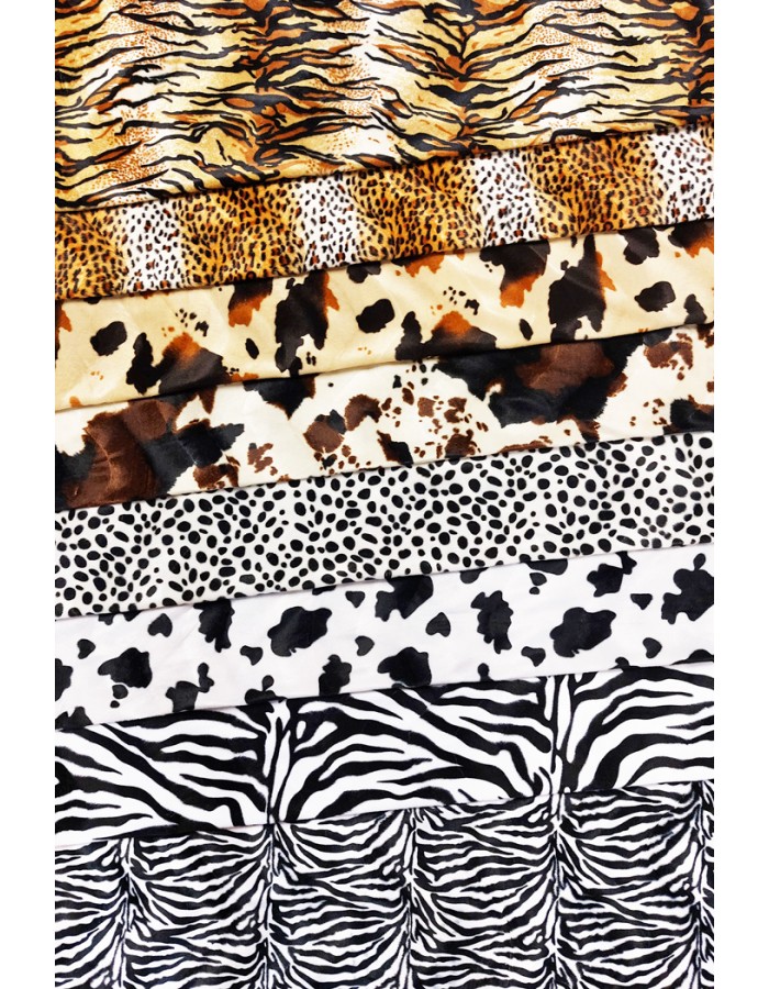 Kahdeksan kuosivaihtoehtoa: tiikeri, leopardi, seepra/luonnonvalkoinen, seepra/valkoinen, dalmatialainen, lehmä valkoinen, lehmä ruskea ja buffalo