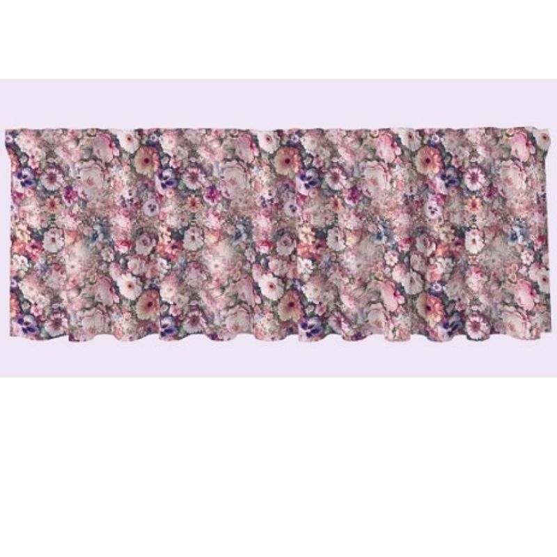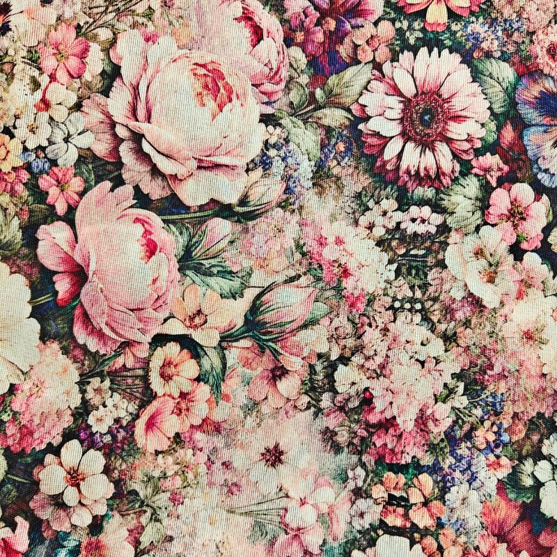 Romanttinen, runsaskukkainen kangas, jossa monen erilaisia kukkia, mm. orvokki, ruusu ja gerbera.