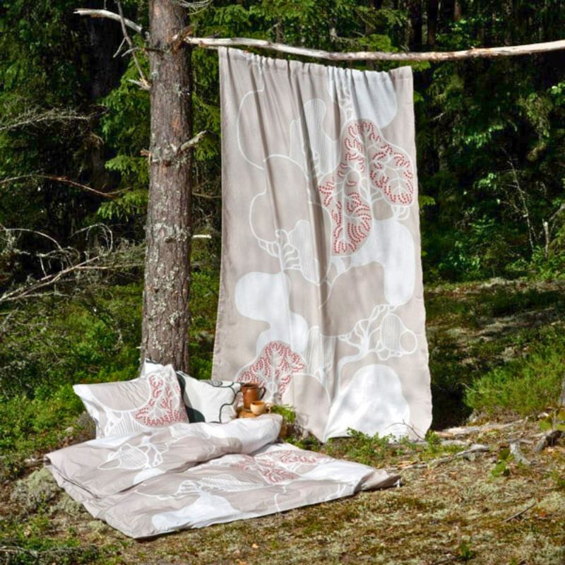 Painettu puuvillakankaaseen, joka soveltuu mm. verhoiksi ja sisustyynynpäällisiin.