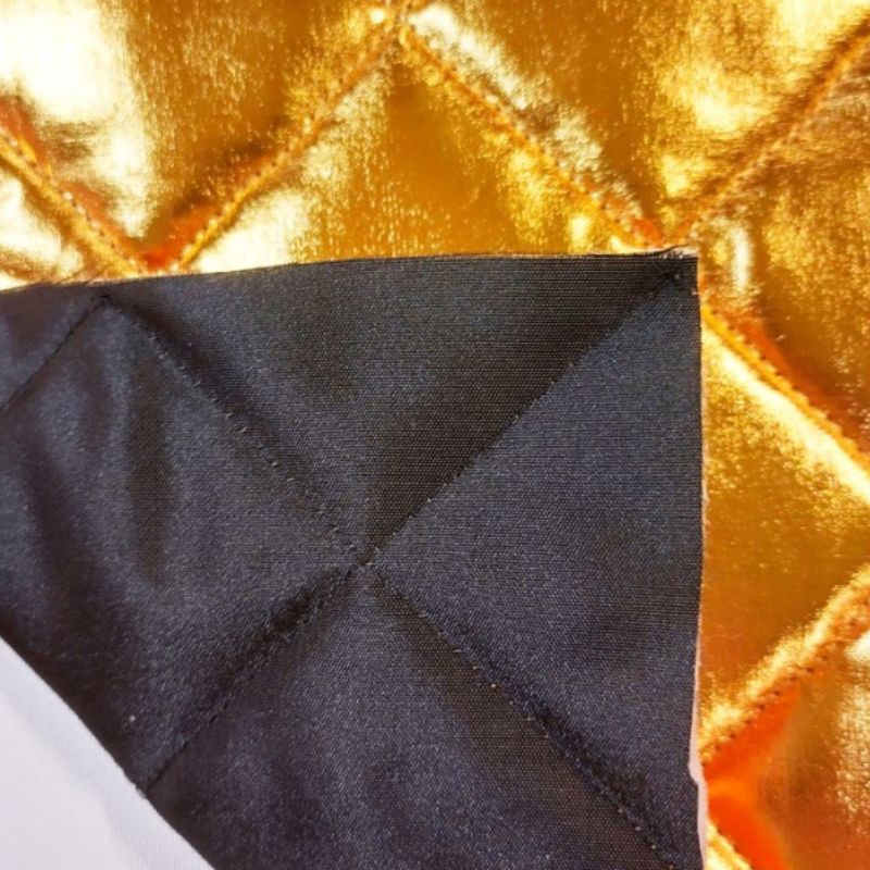 Näyttävä metallinhohtopintainen 5cm vinoruudulla tikattu kangas, jossa on musta vuori toisella puolella.