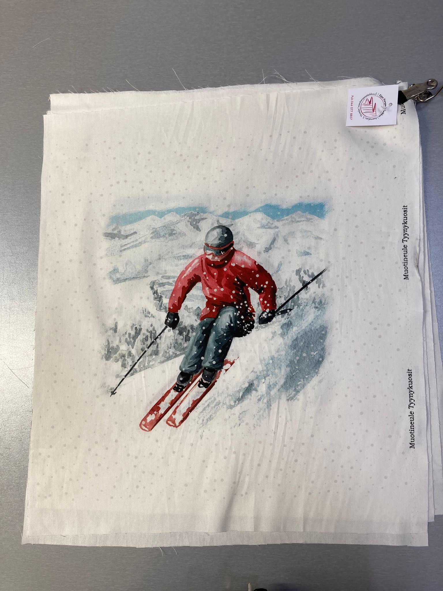 Painettu puuvillapala, jossa laskettelija talvimaisemassa.