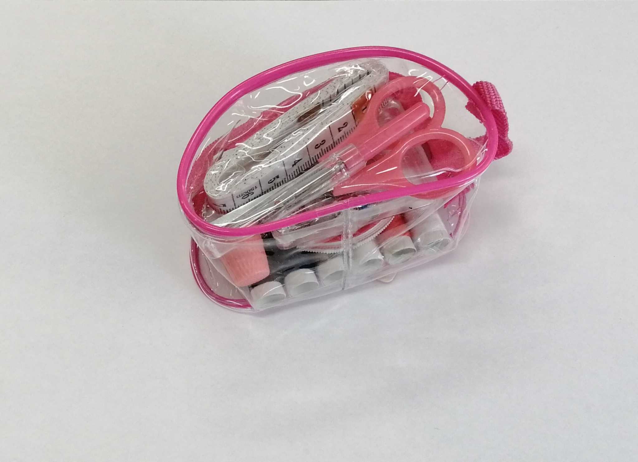 sakset, mittanauha, ratkoja, sormustin, ompeluneuloja, hakaneuloja, hakaneuloja, nappeja, näppäreitä ja useita 6 eri väristä lankaa.