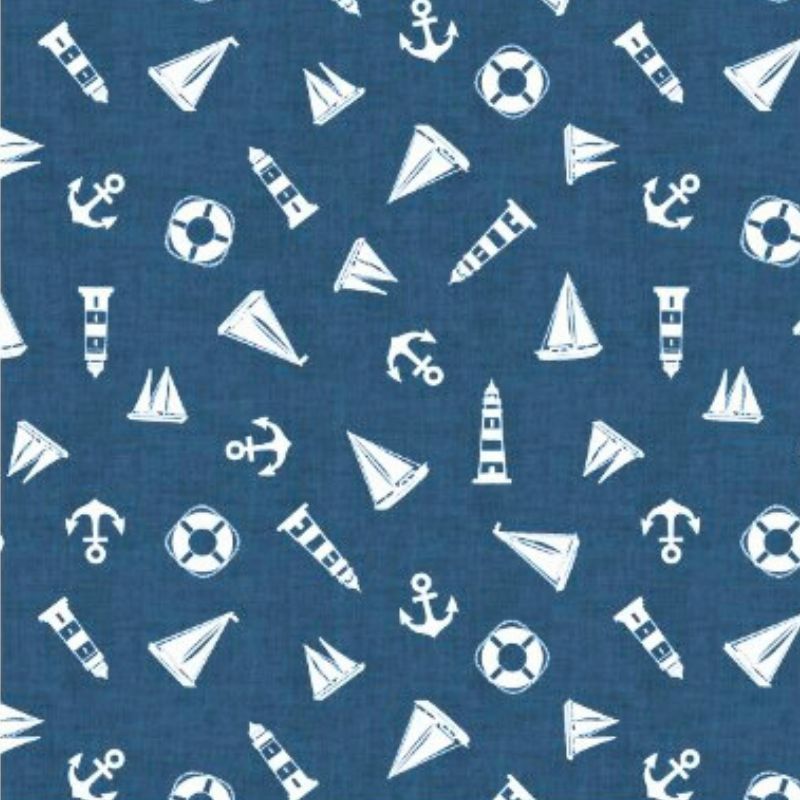 Farkun sinisellä pohjalla valkoisia kuvioita: purjevene, majakka, ankkuri, majakka ja pelastusrengas.