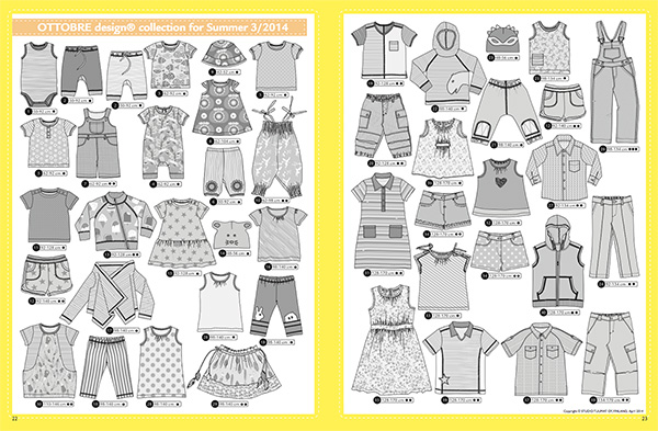 Riemukkaita kesävaatteita leikki-ikäisille ja vähän isommillekin. Unisex-vaatteita työtille ja pojille: monta kivaa toppia ja T-paitaa, trikoohousuja, shortseja, trikoopipoja, lappuhaalari denimistä, shortsit pellavasta ja vetoketjutakki jerseystä. Tytöille lisäksi hame, mekko ja tunika ja pojalle kauluspaita ja suorat housut 70-luvun malliin. Koot 92-140 cm.