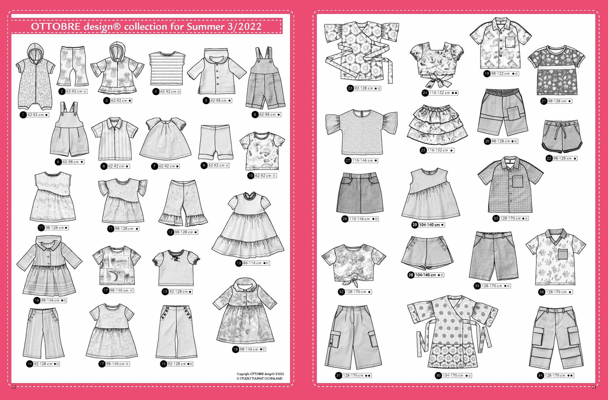 Kesälomalaisen kevyet asukokonaisuudet. Popliinipaita ja -bermudat. Raidalliset merimieshousut ja -mekko sekä T-paita ja nyöritetty jerseypaita. Denimshortsit ja puuvillatoppi. Kaksi luomupuuvillaista jerseymekkoa. Hihaton jerseytoppi, merimiespaita ja olkainhousut pienelle.