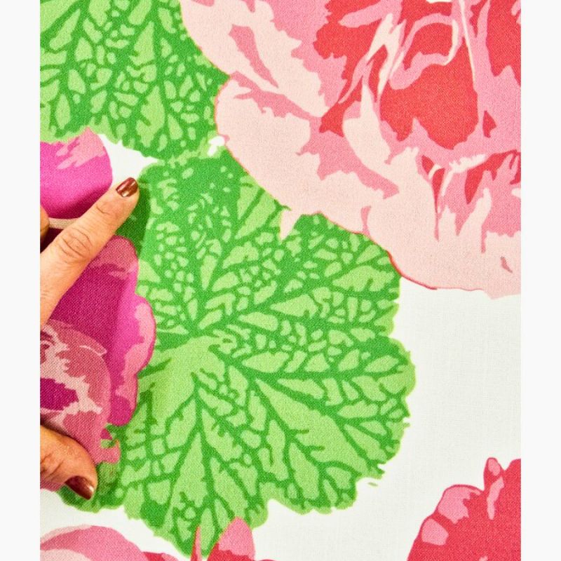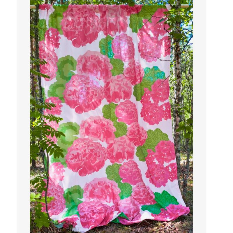Pelargonia on Merja Palinin suunnittelema kuosi, jonka värit hehkuvat upeasti valkoisella pohjalla.