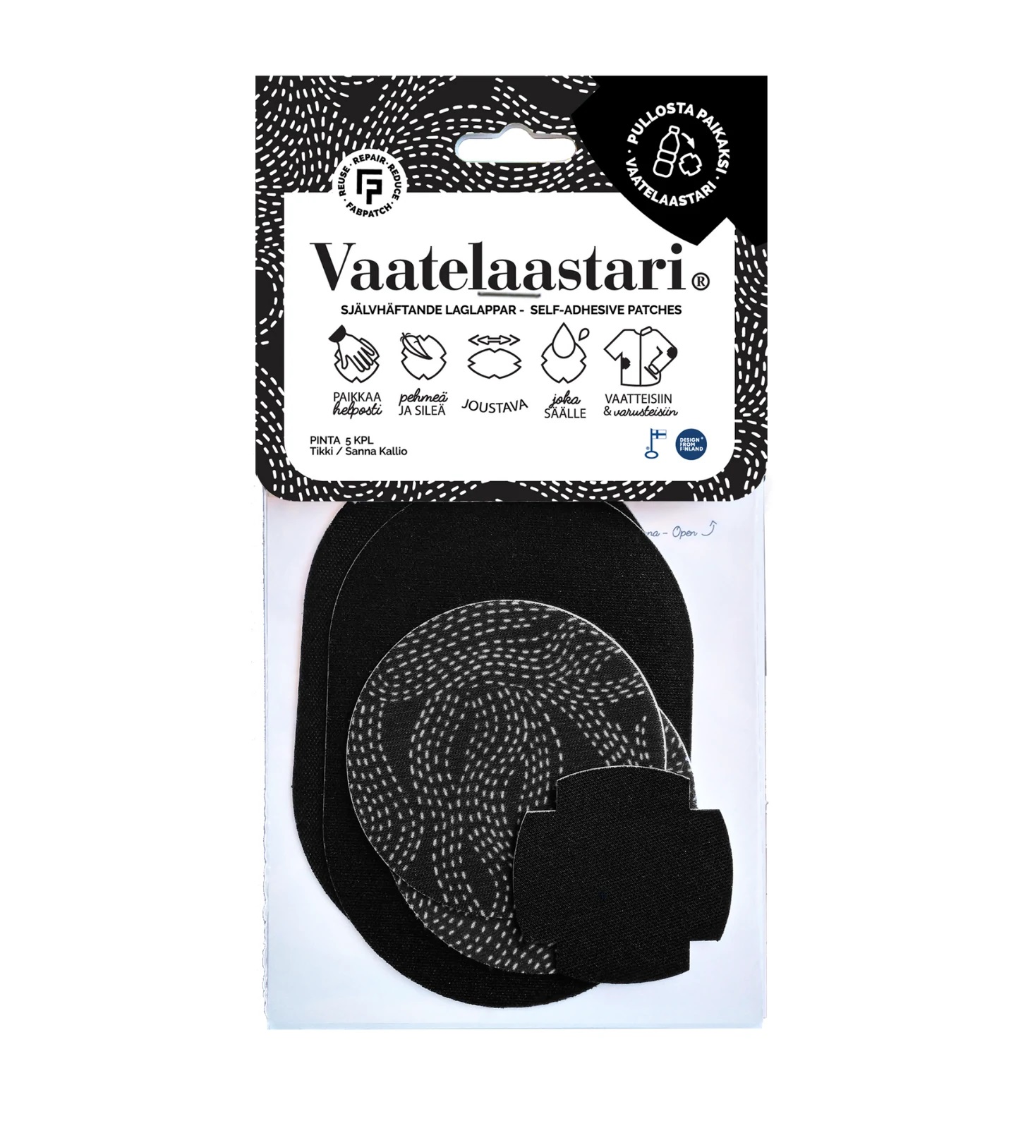 - Kierrätys tekstiilijätteen mukana. Muista kierrättää myös pakkaus! Pussi on valmistettu Suomessa, ja sen muovin raaka-aine on uusiutuvaa luonnonvaraa; sokeriruokoa.