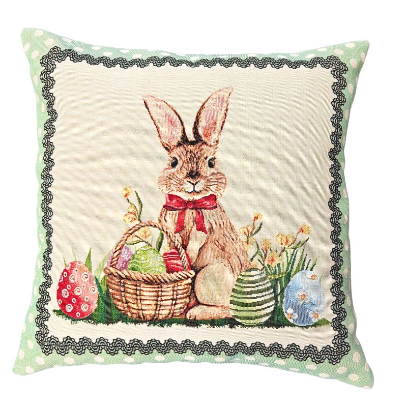 Kudottu gobeliini, pupu korin ja pääsiäismunien sekä narsissien kera.