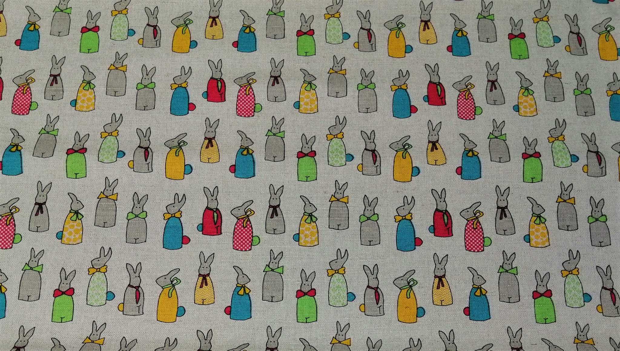 Pellavan värisellä pohjalla iloisen värisiä pupuja.