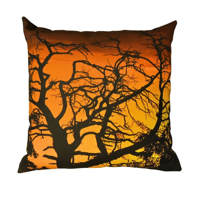 Valokuvaaja Jaakko Tähden valokuvasta kankaalle painettu luontokuva – oranssikeltaisella pohjalla puun oksiston siluetti mustalla