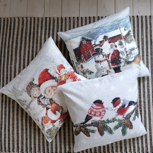 Kolme eri kuviovaihtoehtoa: joulupukki ja lapset, punatulkut sekä joulupukki ja lumiukko