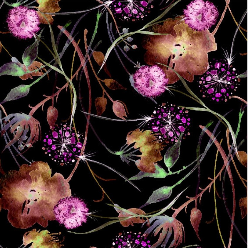 Mustalla pohjalla lilan ja oranssinruskean sävyisiä kukintoja sekä varsi