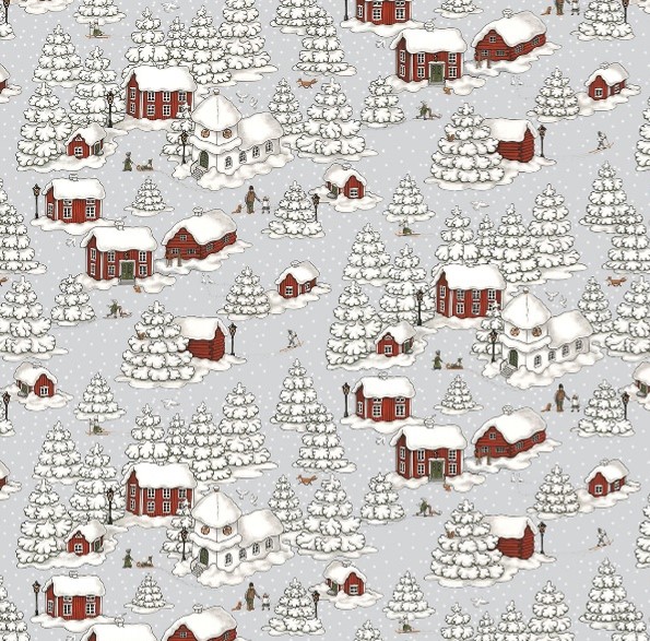 Painettu puuvillakangas, jossa talvinen kylämaisema. Soveltuu verhoihin, pöytäliinaksi, kangastauluksi, sisustustyynyiksi jne.