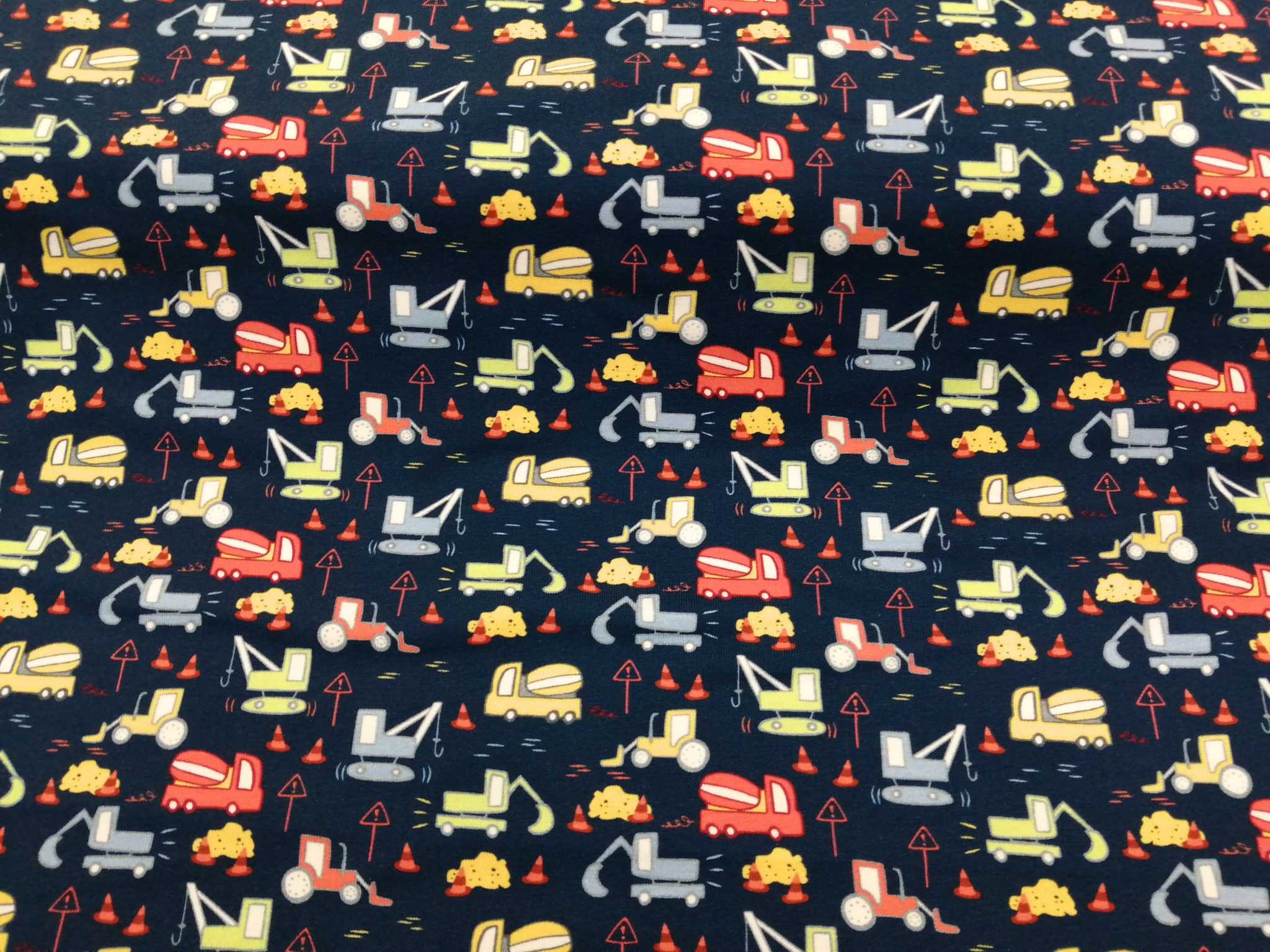 Tummansinisellä pohjalla erilaisia värikkäitä työkoneita, mm. betoniauto, kauhakuormaaja, puskutraktori