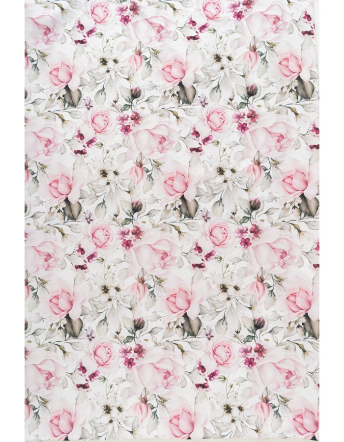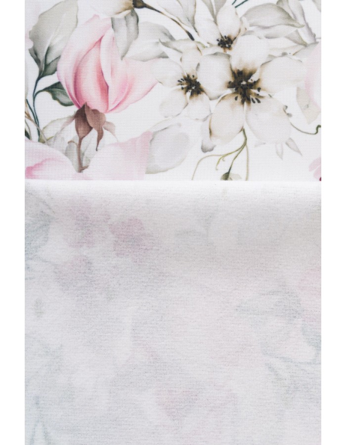 Hempeän lempeä kukkakuosi valkoisella pohjalla.