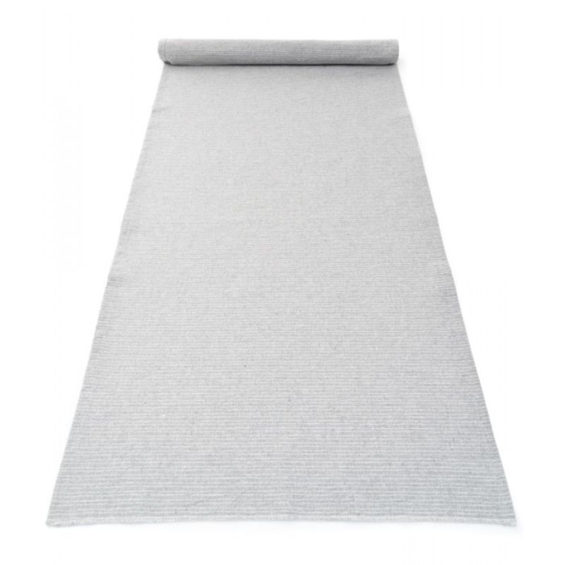 Vaaleanharmaalla pohjalla ohuita valkoisia kudottuja raitoja hieman epätasaisesti.