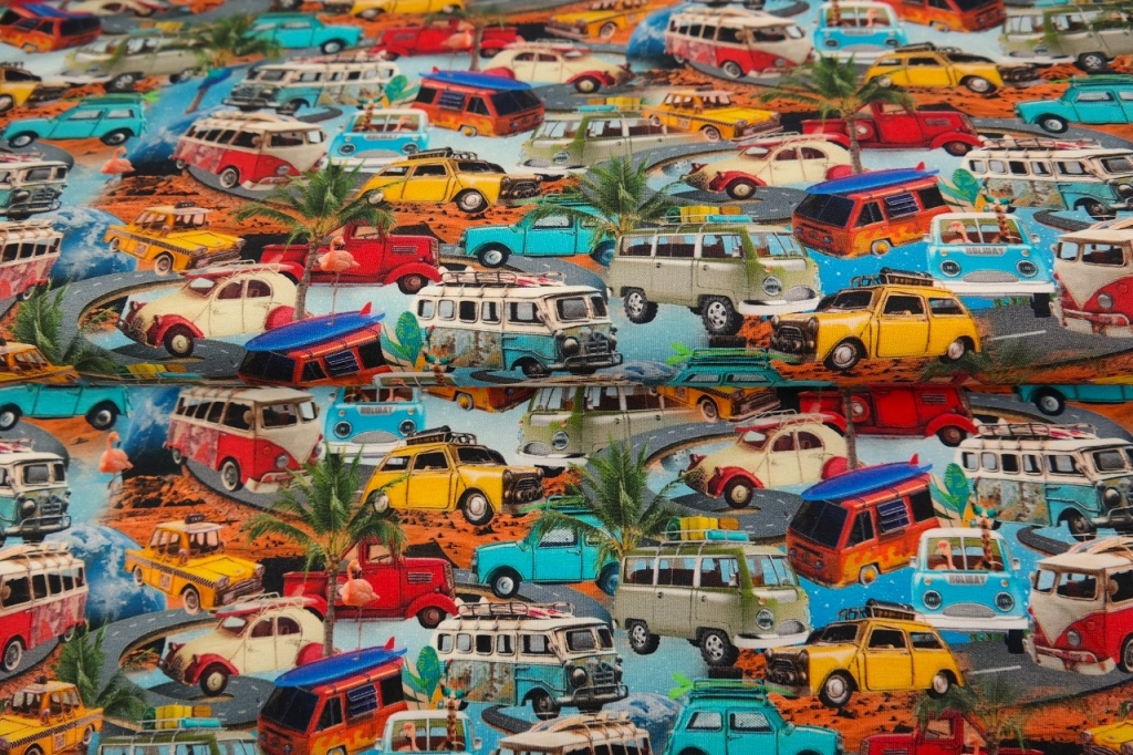 Värikäs auto aiheinen puuvillaelastaanitrikoo